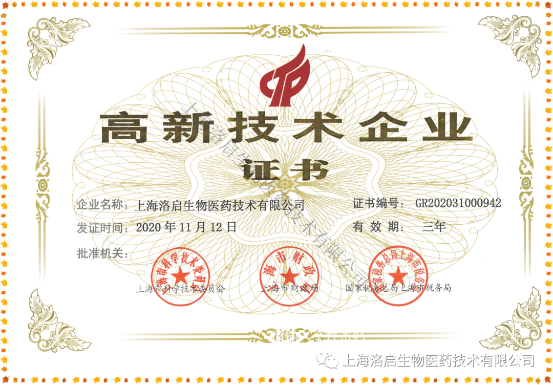 近期,上海30116金沙js9(中国)生物医药技术有限公司取得了由上海市科学技术委员会、上海市财政局、国家税务总局上海市税务局联合颁发的“高新技术企业证书”。