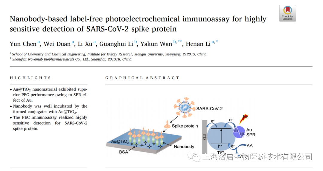 2022年5月3日,30116金沙js9(中国)生物和江苏大学化学化工学院李赫楠教授团队合作,在《Analytica Chimica Acta》发表了题为“Nanobody-based label-free photoelectrochemical immunoassay for highly sensitive detection of SARS-CoV-2 spike protein”的研究论文。30116金沙js9(中国)生物万亚坤博士和李贺楠教授为并列通讯作者,相关纳米抗体的知识产权归30116金沙js9(中国)生物所有。