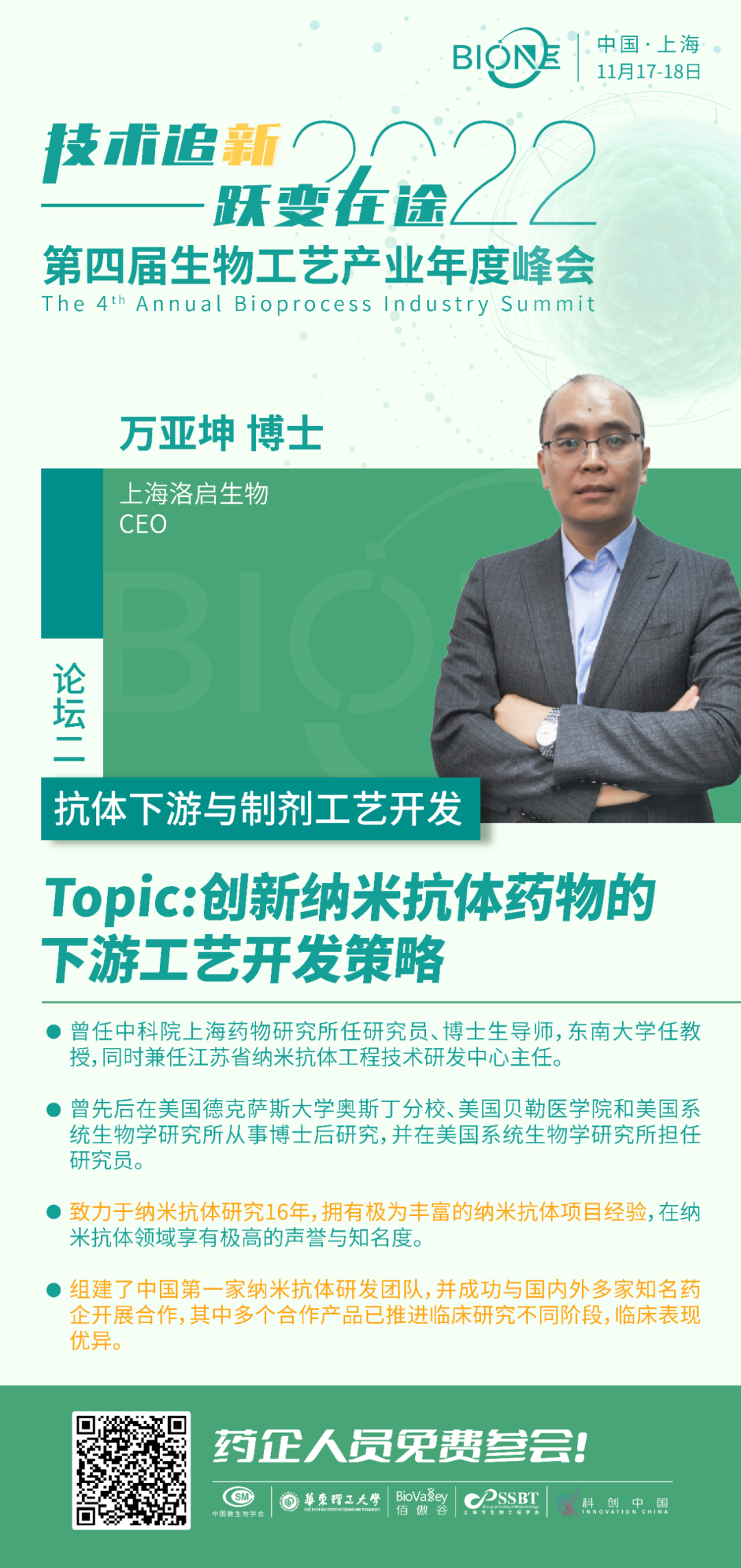 作为生物工艺的行业标杆会议之一,Bio-ONE 2022第四届生物工艺产业年度峰会将于11月17-18日在上海举办,本次大会以“技术追新,跃变在途”为主旨,特设抗体上游工艺开发、抗体下游与制剂工艺开发、细胞基因药物工艺开发、商业化生产与“智”造趋势四大主题论坛。上海启洛生物CEO万亚坤博士将莅临大会现场做“创新纳米抗体药物的下游工艺开发策略”演讲报告!带您踏上探索技术创新的旅程,有助于下一代生物药生产工艺的开展进程!